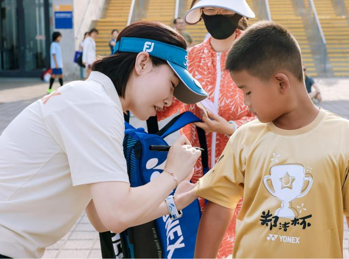 郑洁为参加“郑洁杯”青少年网球巡回赛的小球员签名。