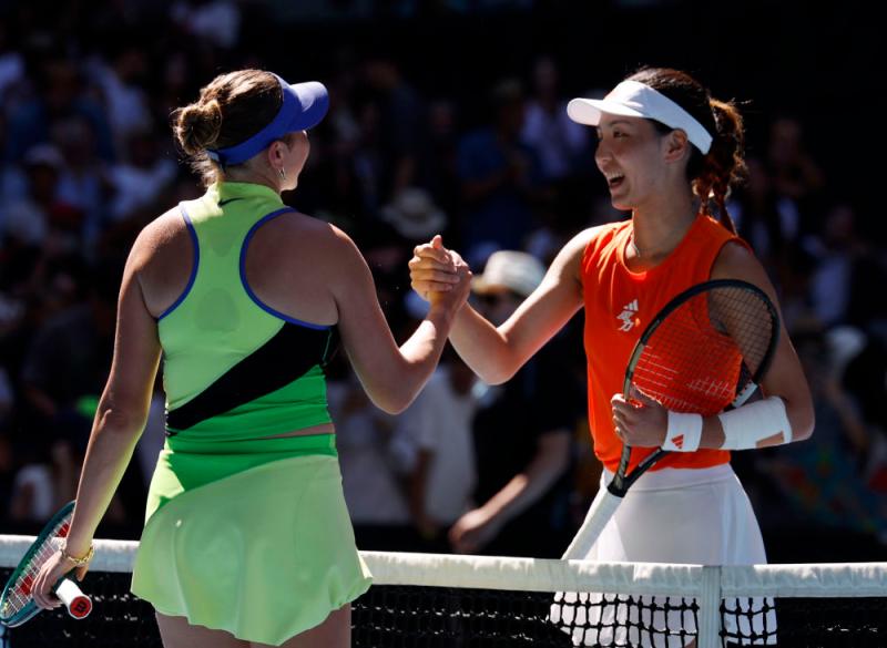 1月26日,王欣瑜(右)与阿尼西莫娃在2026年澳大利亚网球公开赛女单第四轮比赛后握手致意。新华社记者 马平 摄