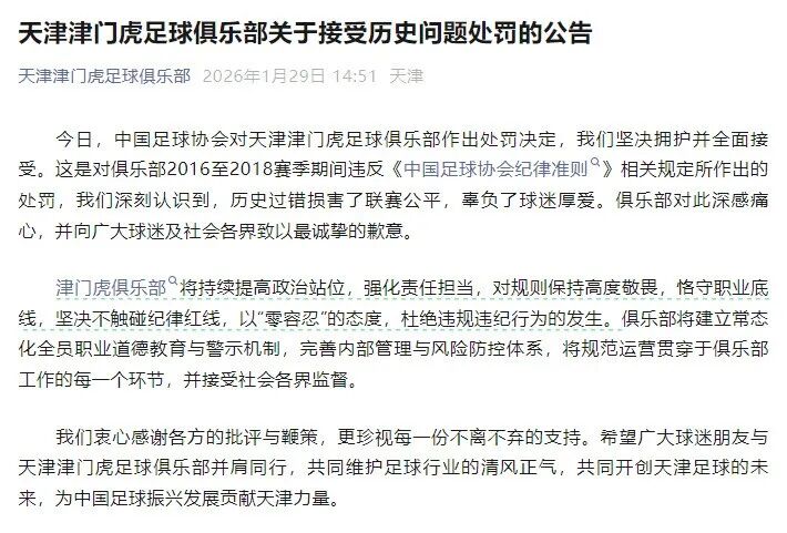 天津津门虎足球俱乐部官微发布“关于接受历史问题处罚的公告”。全文如下——